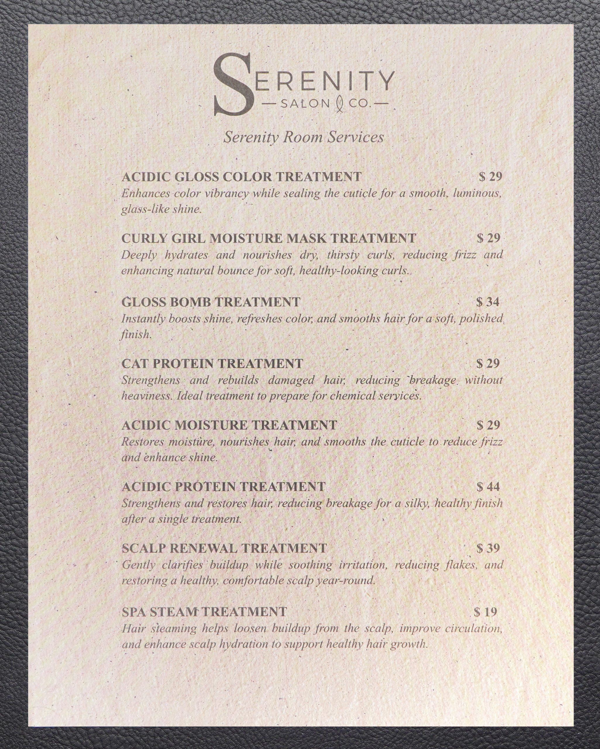 • We will do everything we can to make you look and feel your best when you leave Serenity. With that in mind, there are no redos on complimentary services (styling, wash, and/or 5 minute head massages for example) that come with main services.