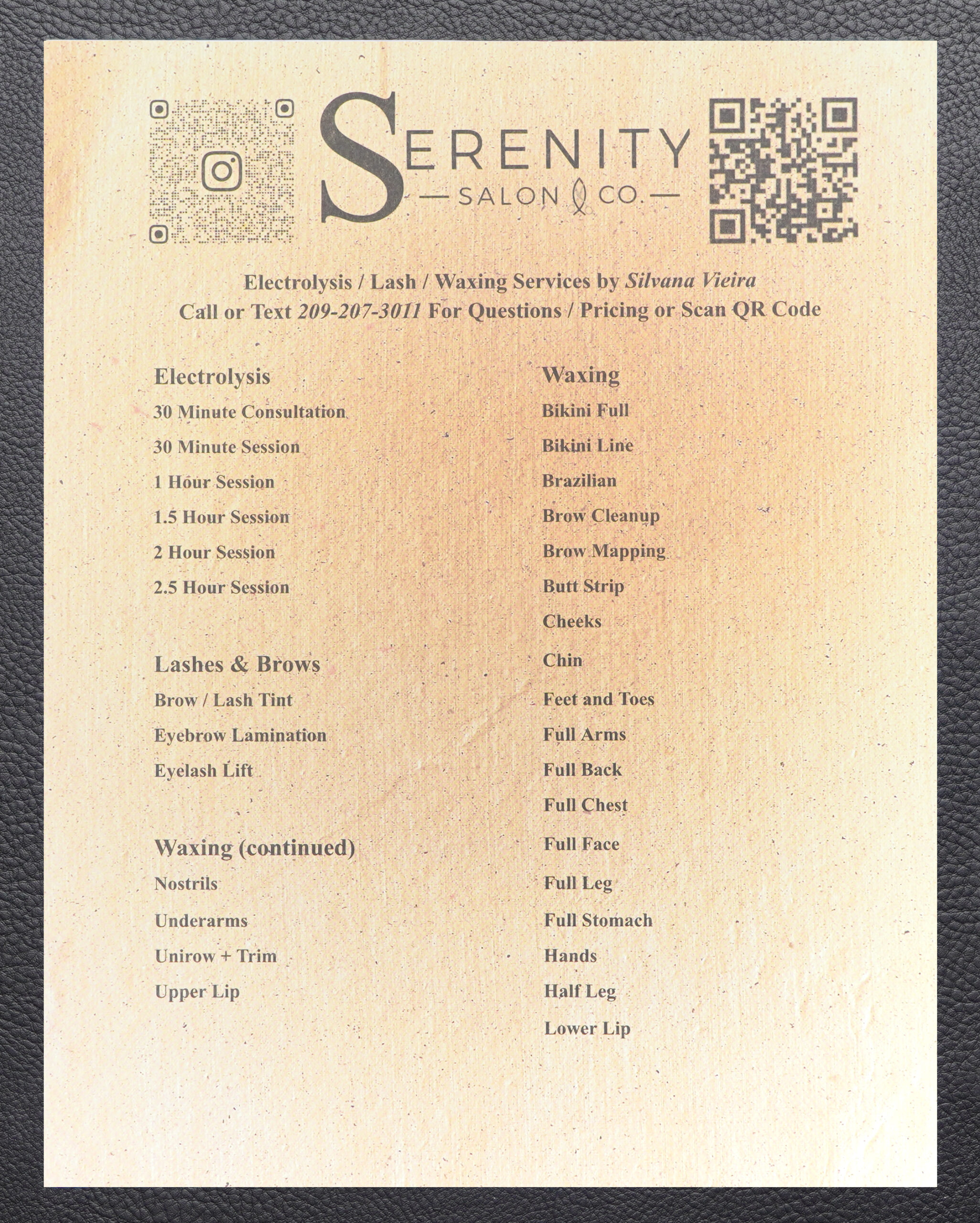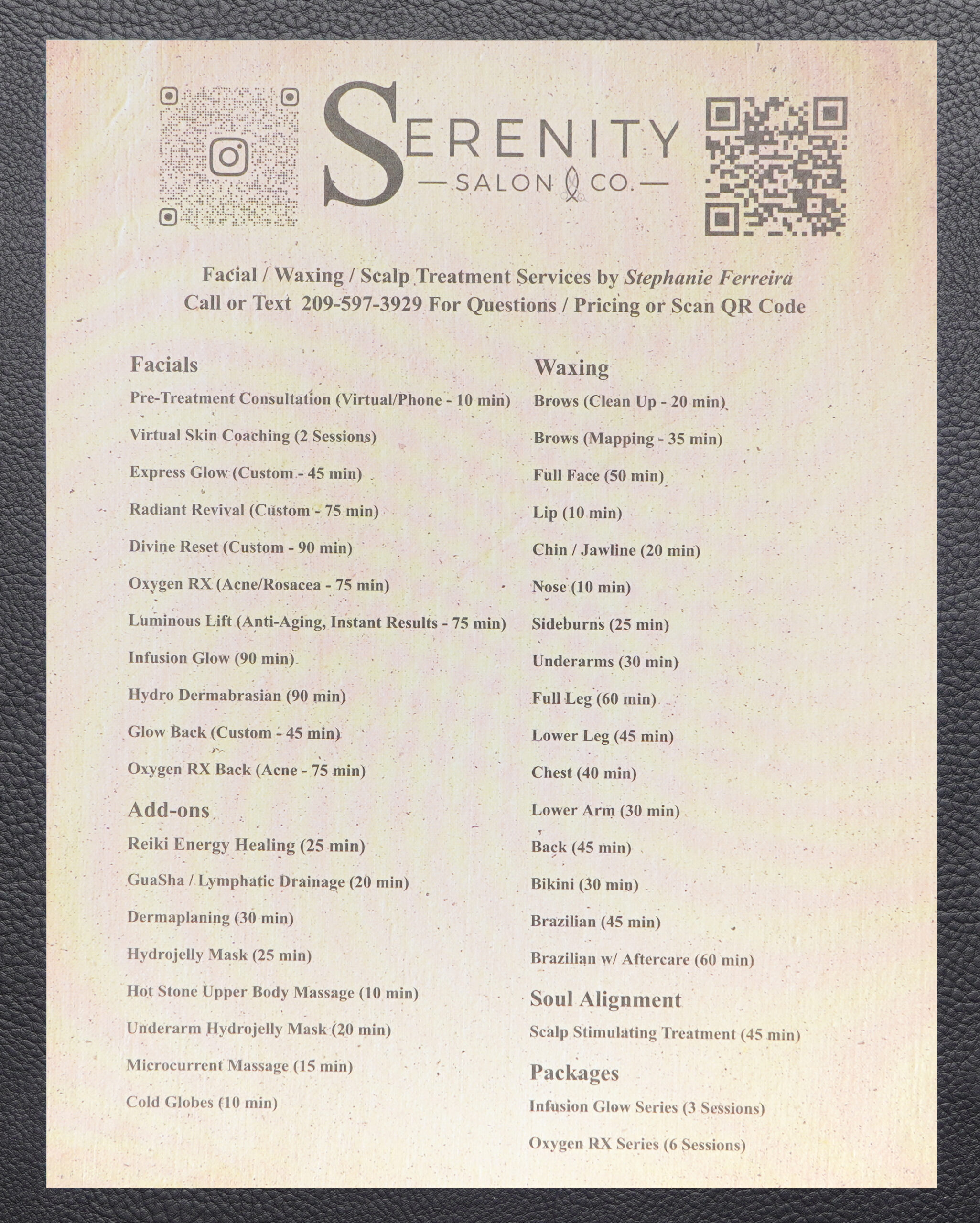 • Serenity has a 48 hour cancellation/rescheduling policy. If canceling/rescheduling before 48 hours of appointment, paid deposits will stay on account as credit used towards future services or clients may request to receive a full refund (No refund of any kind beyond 45 days). Canceling/Rescheduling within 48 hours of appointment will result in half of booked services being charged since it may be too late to fill that time slot. No refunds. If an emergency comes up, please let us know as soon as possible. No Call/No Show appointments will be charged in full with card on file for all scheduled services as early as 30 minutes after appointment time. No Call/No Show appointments are when clients don’t show up for their appointment and don’t call us to cancel or reschedule before appointment time. No refunds.